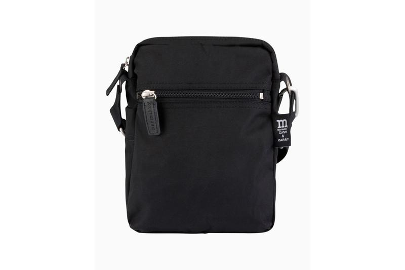 Die Cash & Carry-Umhängetasche besteht aus recyceltem Polyamid. Die Tasche hat einen Reißverschluss, zwei kleine Reißverschlusstaschen außen und eine Reißverschlusstasche innen. Der verstellbare Schultergurt besteht aus Nylon und verfügt über einen Karabinerhaken zum Aufhängen kleiner Gegenstände.