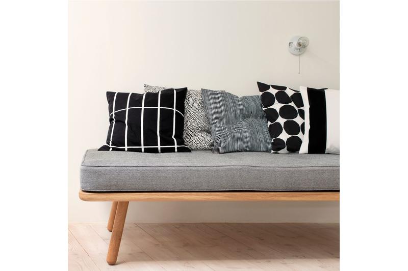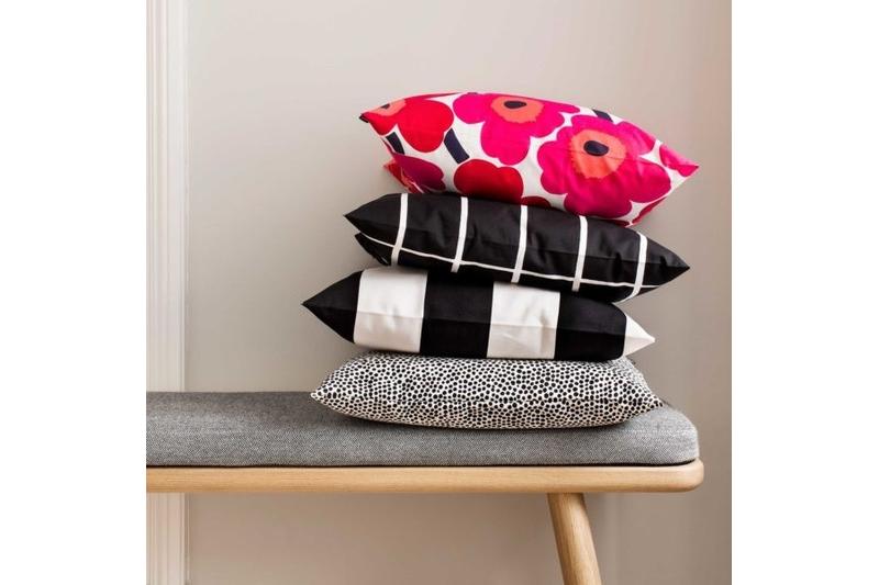 Das Muster Pirput Parput der Designerin Vuokko Eskolin-Nurmesniemi ist ein elegantes, dezentes Muster mit weißem Hintergrund und schwarzen Polka-Dots. Dieses Muster ist unendlich vielseitig und lässt sich mit anderen einfarbigen oder gemusterten Drucken bestens kombinieren.